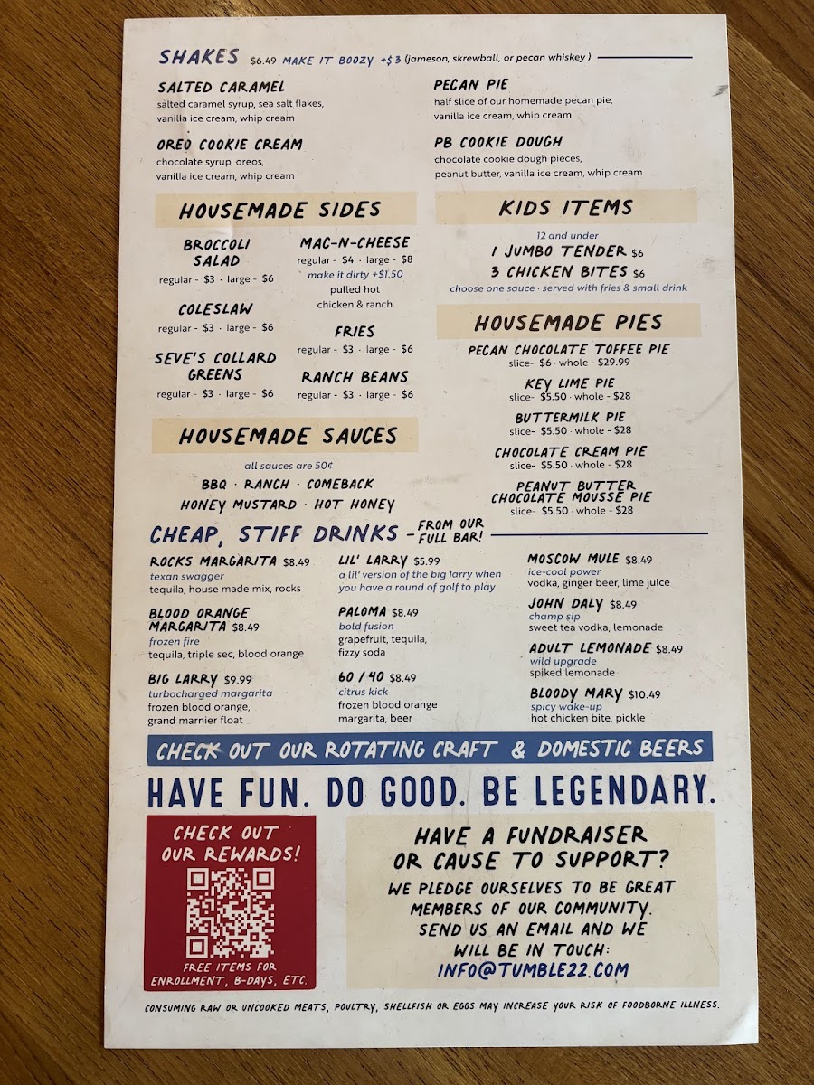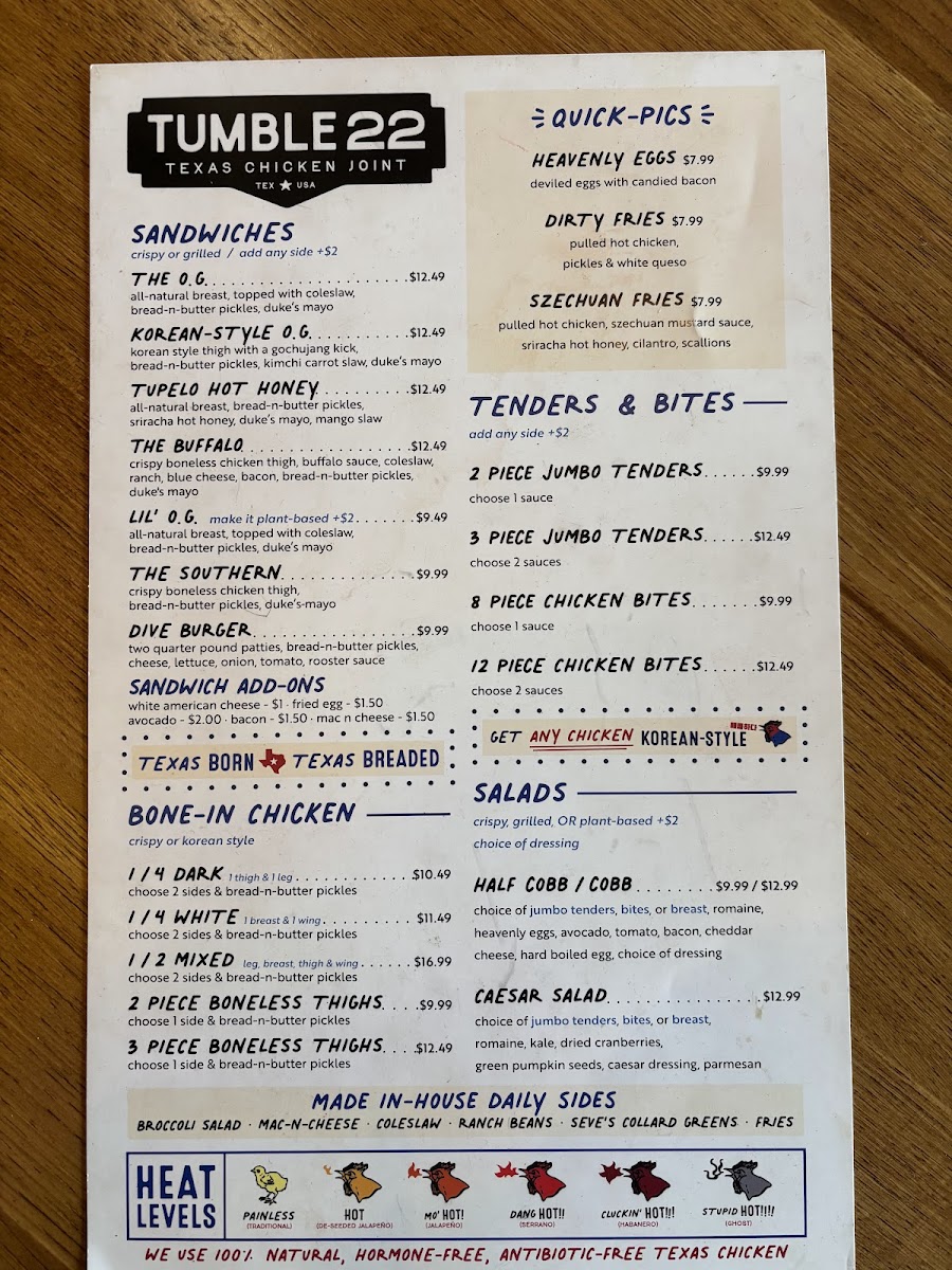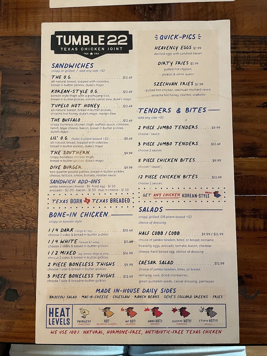 Welcome to Tumble 22 - Texas Chicken Joint, where each bite of their renowned hot chicken promises an unforgettable experience. Nestled in San Marcos, this casual eatery celebrates a unique blend of flavor and spice, featuring Texas-raised chicken that is hand-breaded and tumbled precisely twenty-two times for that ideal crunch.